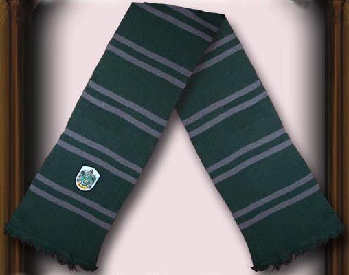 - A deluxe Slytherin scarf -- has the Slytherin crest and is made of lamb's wool, measuring 9 1/2 inches wide and 68 inches long (including the 1-inch tassels at the end)