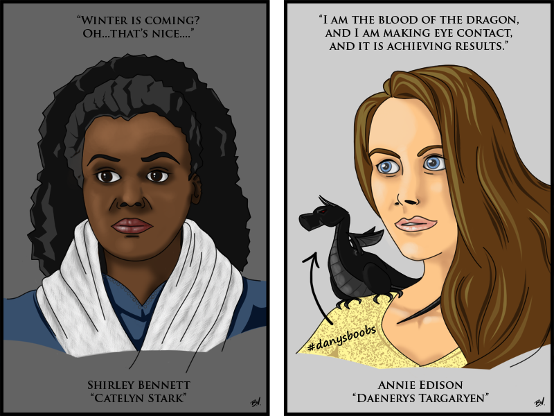 This artist is celebrating the return of Community by artwork depicting each of the characters as a Game of Thrones character! Two of my favorite fandoms colliding!